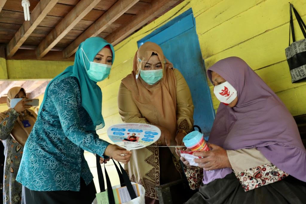 Aceh Besar — Dalam rangka menyukseskan hari puncak Gerakan Bersama Pemakaian Masker Aceh (GEMA), Wakil Ketua Satuan Tugas Covid-19 Aceh, Dyah Erti Idawati, bersama Tim Penggerak PKK Aceh, melaksanakan pembagian dan sosialisasi pemakaian masker secara door to door ke rumah warga, di Gampong Cot Karieng, Kecamatan Blang Bintang, Aceh Besar, Jumat, (4/9).