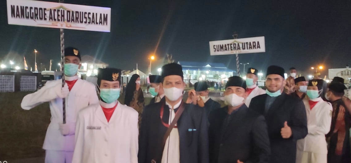 Pawai : Malam pembukaan pelaksanaan STQHN ke -26 juga dilakukan pawai kafilh, tampak kafilah Aceh saat pawai didepan panggung utama STQH tahun 2021 di Maluku Utara.
