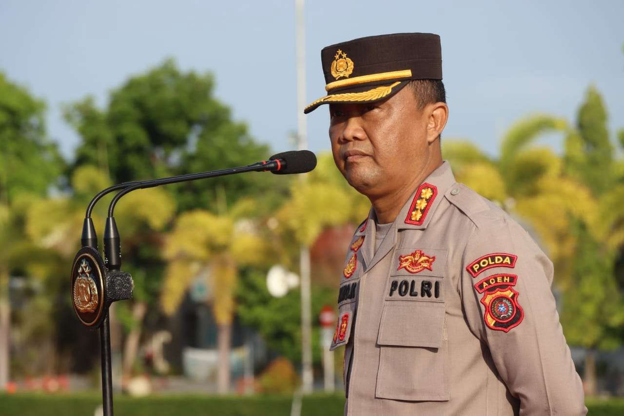 | Kepala Bidang Hubungan Masyarakat Polda Aceh, Kombes Pol. Joko Krisdiyanto, S.I.K., sedang memimpin apel pagi di halaman Mapolda Aceh pada Senin (29/5/2023). Foto: Humas Polda Aceh. |