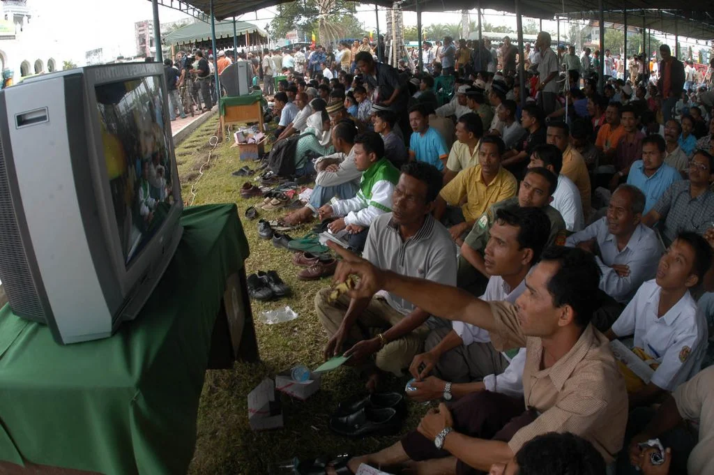 Masyarakat aceh sedang menyaksikan penandatanganan perjanjian damai melalui televisi di halaman Mesjid Raya Baiturrahman Banda Aceh. (Foto: Hotli Simanjuntak/digdata.ID).