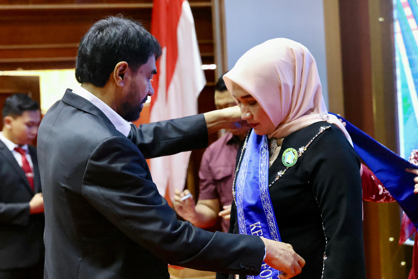 Acara kemudian dilanjutkan dengan prosesi penyematan pin kepada Wakil Ketua Dekranasda Aceh, Mukarramah Fadhlullah, sebagai simbol pengukuhan dan pengembanan tugas baru.