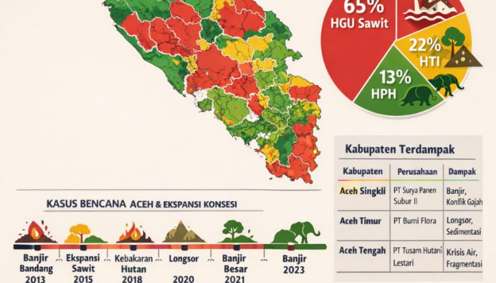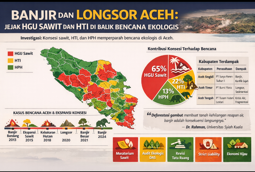 Investigasi mengungkap bahwa ratusan konsesi sawit, HTI, dan HPH di Aceh memperparah banjir, longsor, dan krisis air, sementara pemerintah daerah masih bergulat dengan perizinan dan pengawasan.