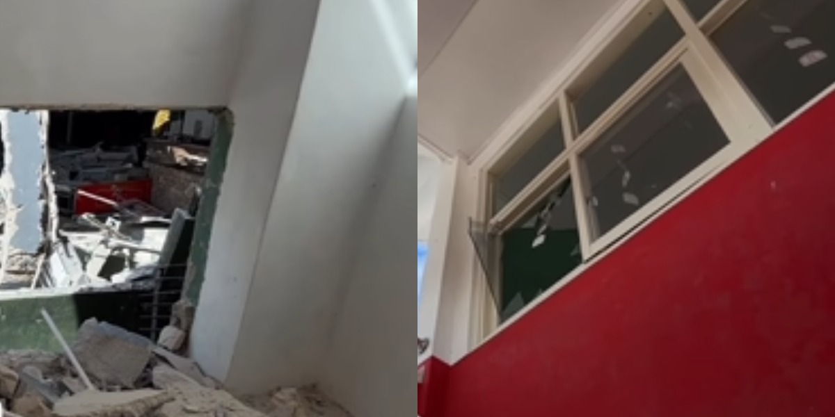 Terlihat dalam video yang beredar, tembok dan pagar sekolah ambruk akibat kuatnya ledakan.