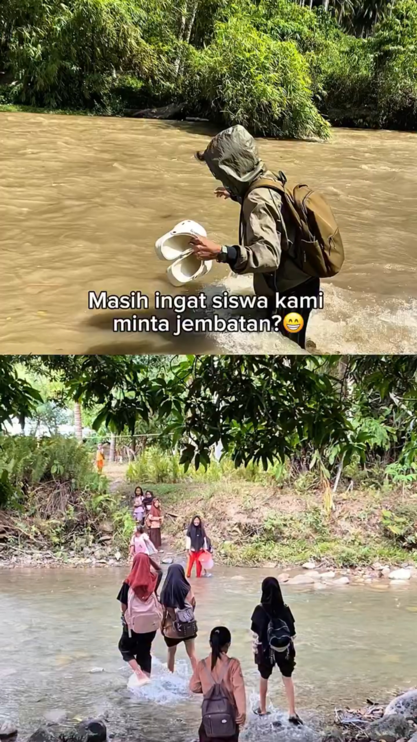 Dalam video yang dibagikannya, tampak para pelajar SD kesulitan menyeberang ketika permukaan air sungai naik.