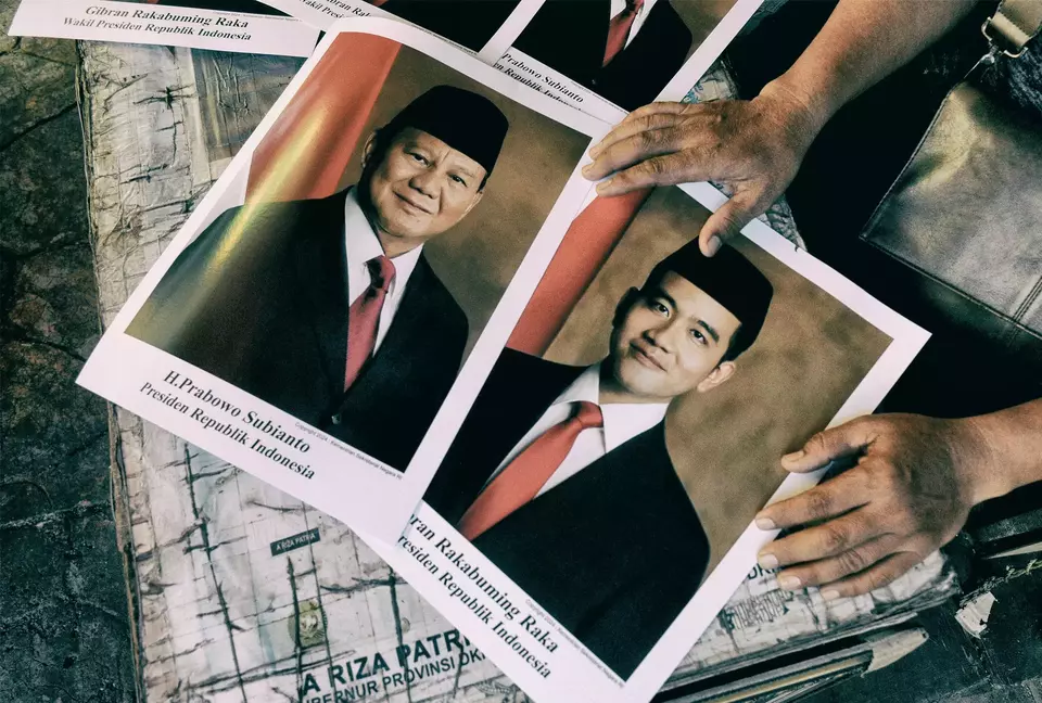 Pedagang menata poster foto pasangan Prabowo-Gibran sebagai Presiden dan Wakil Presiden 2024-2029 di kawasan Pasar Baru, Jakarta. (Foto: B-Universe Photo/Joanito De Saojoao). |