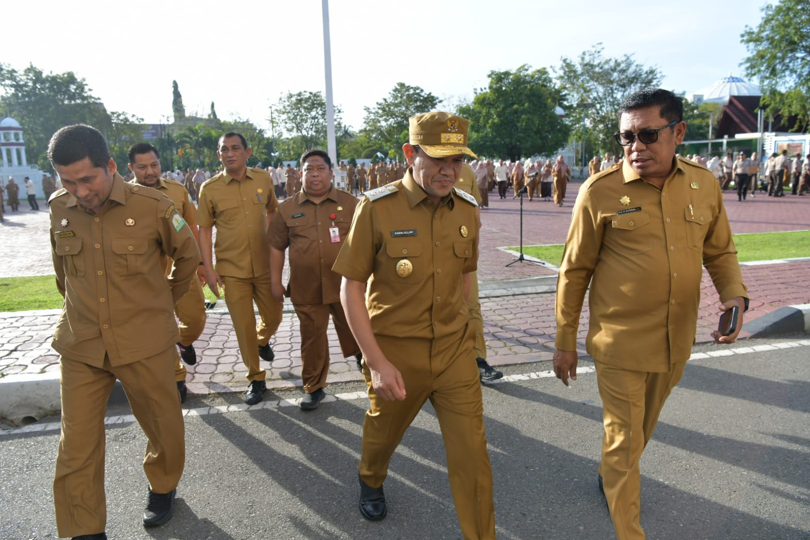 Wagub Aceh, Fadhlullah (tengah) berjalan meninggalkan lapangan upacara seusai memimpin apel pagi di halaman Kantor Gubernur Aceh, pada Senin (24/2/2025). (Foto: Humas Pemprov Aceh). |